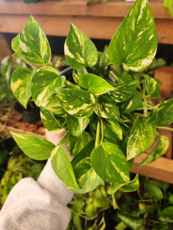 Hawaiian Pothos is a beautiful and vigorous variety of Pothos with large, heart-shaped leaves. The leaves are variegated with bright yellow markings, creating a vibrant and cheerful display. This trailing vine is a popular choice for hanging baskets or climbing up a moss pole.