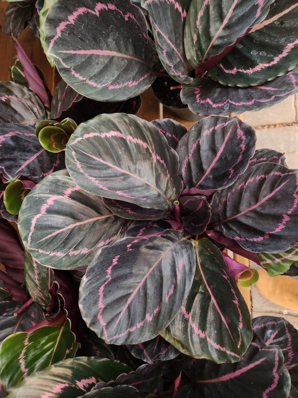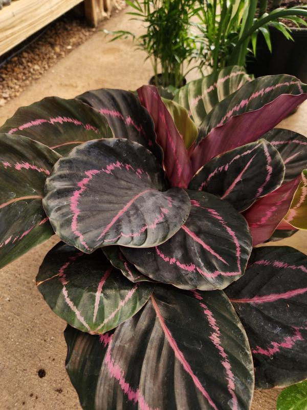 The Calathea Dottie is a showstopping houseplant known for its dramatic, oval-shaped leaves that feature a deep, almost-black green color with contrasting hot pink stripes radiating from the center. Like other Calatheas, it's sometimes called a "Prayer Plant" because its leaves move up and down throughout the day, resembling hands lifted in prayer. This captivating plant is native to the tropical rainforests of Brazil and adds a touch of exotic beauty to any indoor space.