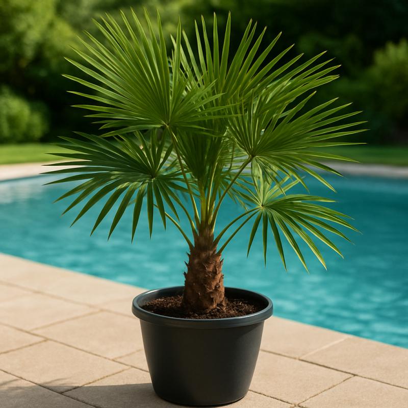 An extremely hardy palm tree with an attractive, compact crown with large, stiff, fan-like, green foliage and distinctive hairy black fibers covering its slender, graceful trunk. A striking specimen that is excellent for making a tropical statement in smaller landscapes and rock gardens. Works well in group plantings and containers.