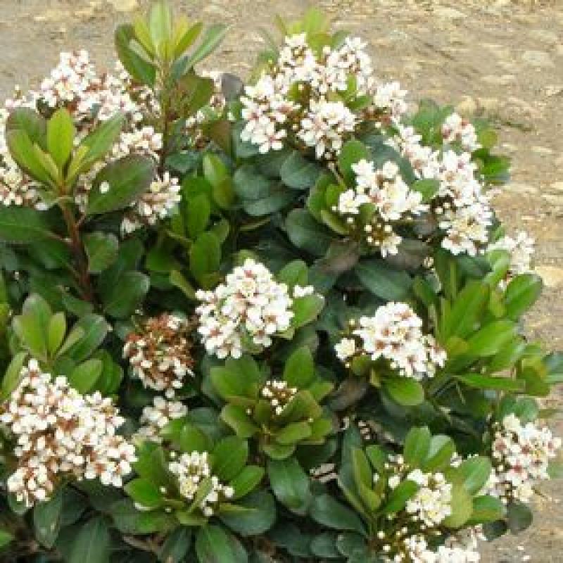 A compact, mounded evergreen with large, dark green, highly disease-resistant foliage that changes to a dramatic, burgundy-red in cold weather. Clusters of pink buds open to pale pink flowers which fade to white, followed by small, blue-black, ornamental fruit. An excellent hedge, accent, or foundation plant for low maintenance landscapes.