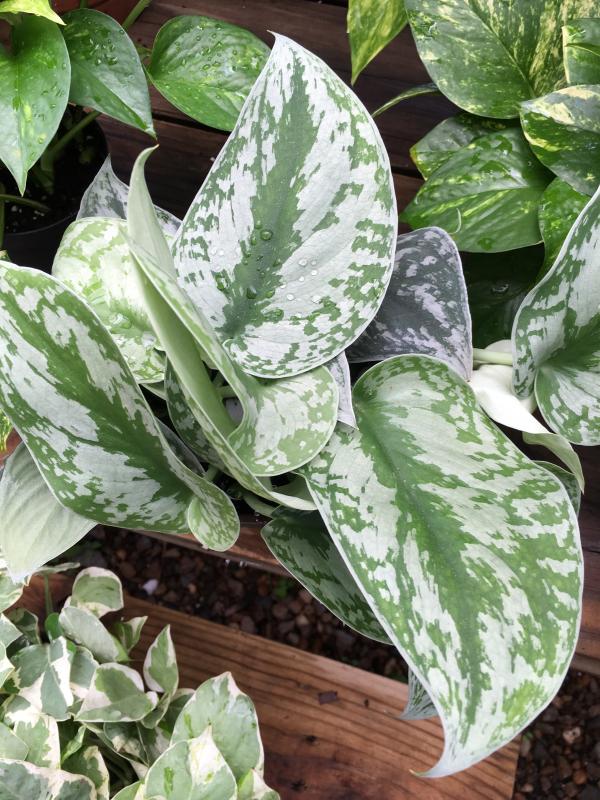 Pothos Satin, also known as Scindapsus pictus 'Argyraeus', is a captivating vining plant with heart-shaped leaves that shimmer in the light. The deep green foliage is adorned with silvery-gray variegation, giving it a satiny appearance. This easy-care plant is a popular choice for hanging baskets or climbing up a moss pole.