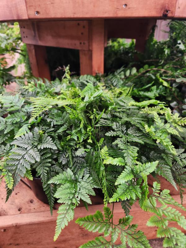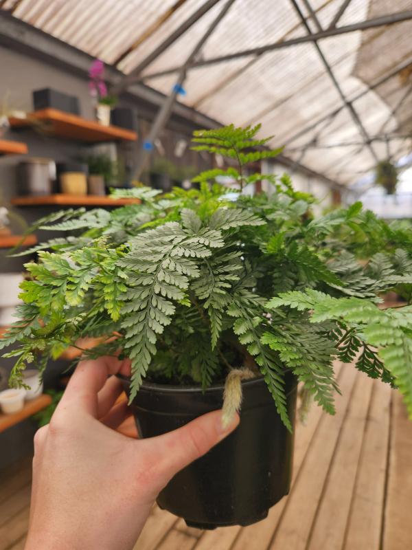 The Rabbit's Foot Fern is an unusual and delightful houseplant that gets its name from the fuzzy rhizomes that grow out of the pot and resemble a rabbit's foot. These furry rhizomes are not roots, but rather modified stems that creep along the soil surface and help the fern to spread. The plant also features delicate, triangular fronds with a lacy texture, adding to its visual appeal.