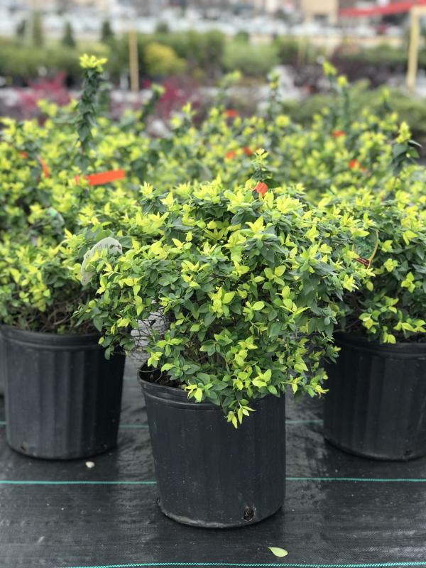 Uniquely colored, evergreen to semi-evergreen Abelia with copper-tinged yellow foliage that gradually turns soft yellow, then green. Fall color is bronze with rose highlighting. Clusters of small, fragrant and pinkish-white flowers summer to frost.