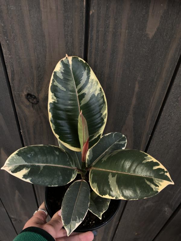 The Rubber Tree Tineke (Ficus elastica 'Tineke') is a stunning variety of the classic Rubber Tree. Its large, leathery leaves are variegated with creamy white, gray-green, and sometimes even pink, creating a truly eye-catching display. This variety adds a touch of elegance and vibrancy to any indoor space.